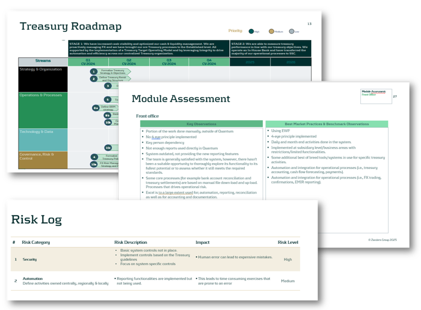In less than a month, at the end of the review, we present to you and discuss an easy-to-understand assessment report with a practical action plan and a tailored roadmap, highlighting quick wins and longer-term improvements. Our approach ensures you have the insights needed to stabilize operations, address risks, and unlock new value from Quantum, all while keeping the process smooth and efficient for your treasury team.