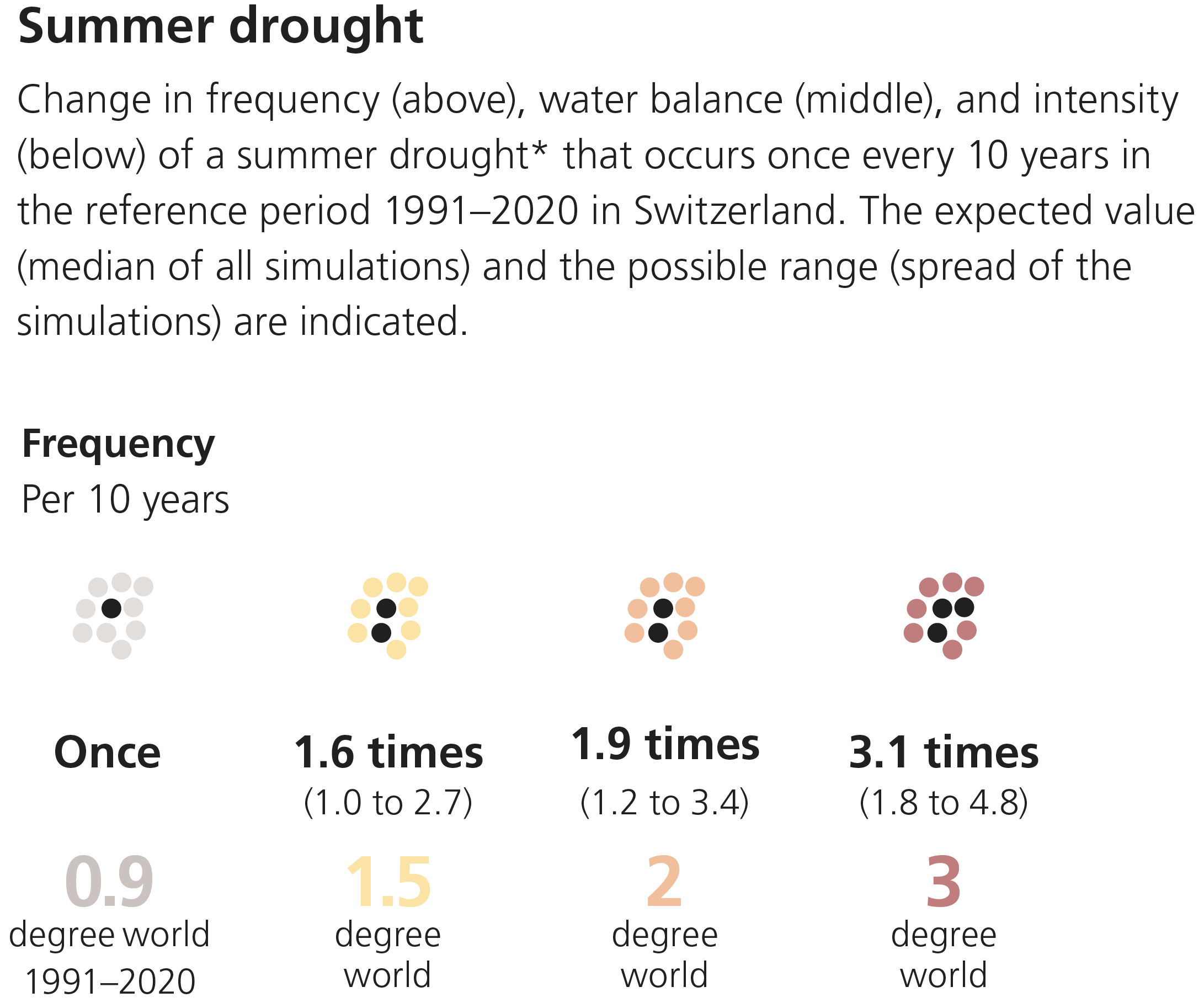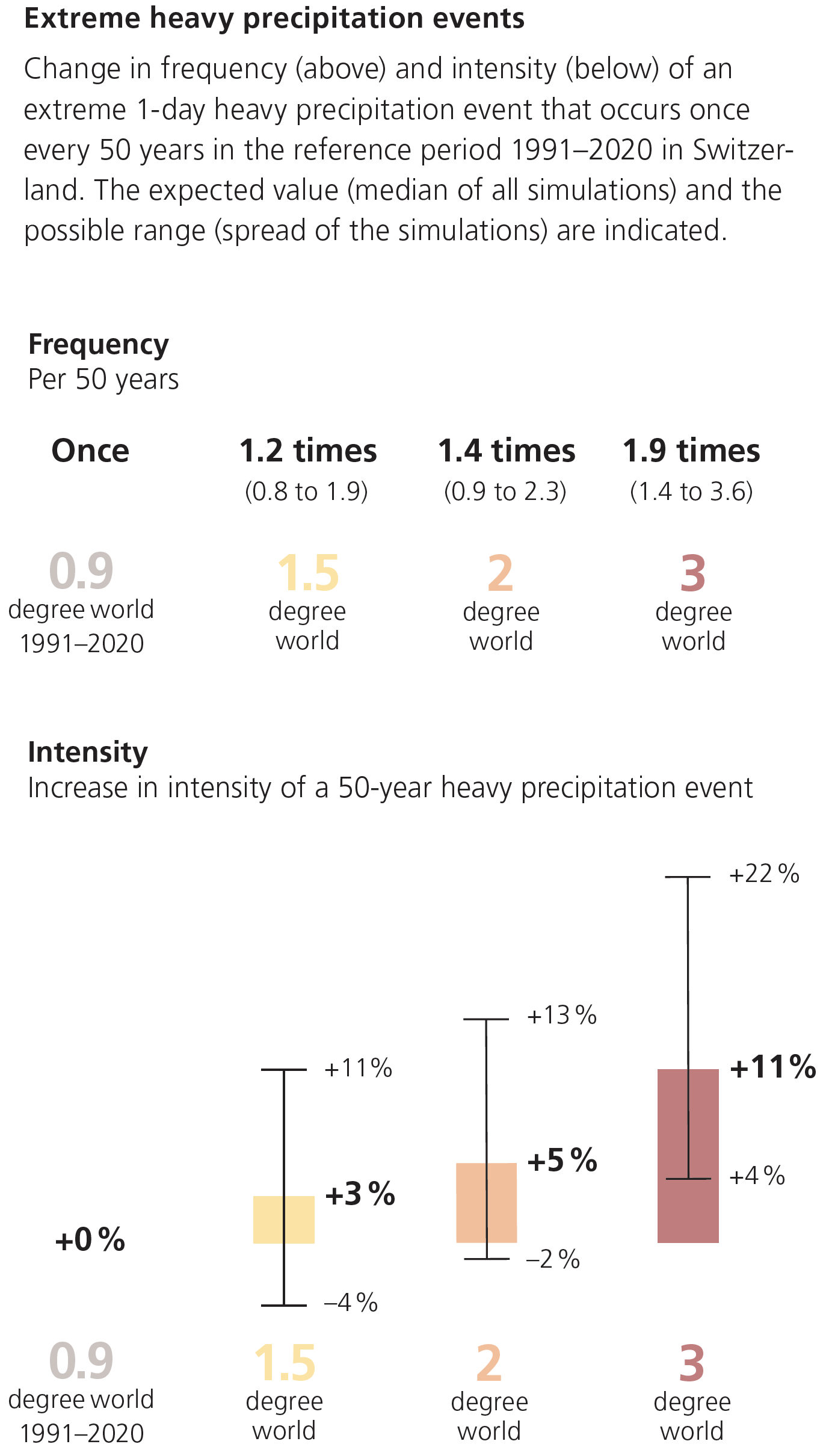 Yearly precipitation is not expected to change in Switzerland with global warming, but summers are expected to get drier and winters are expected to get wetter. Moreover, extreme precipitation (heavy rainfall, hail) is expected to increase in both frequency and intensity, as depicted in the Figure below.