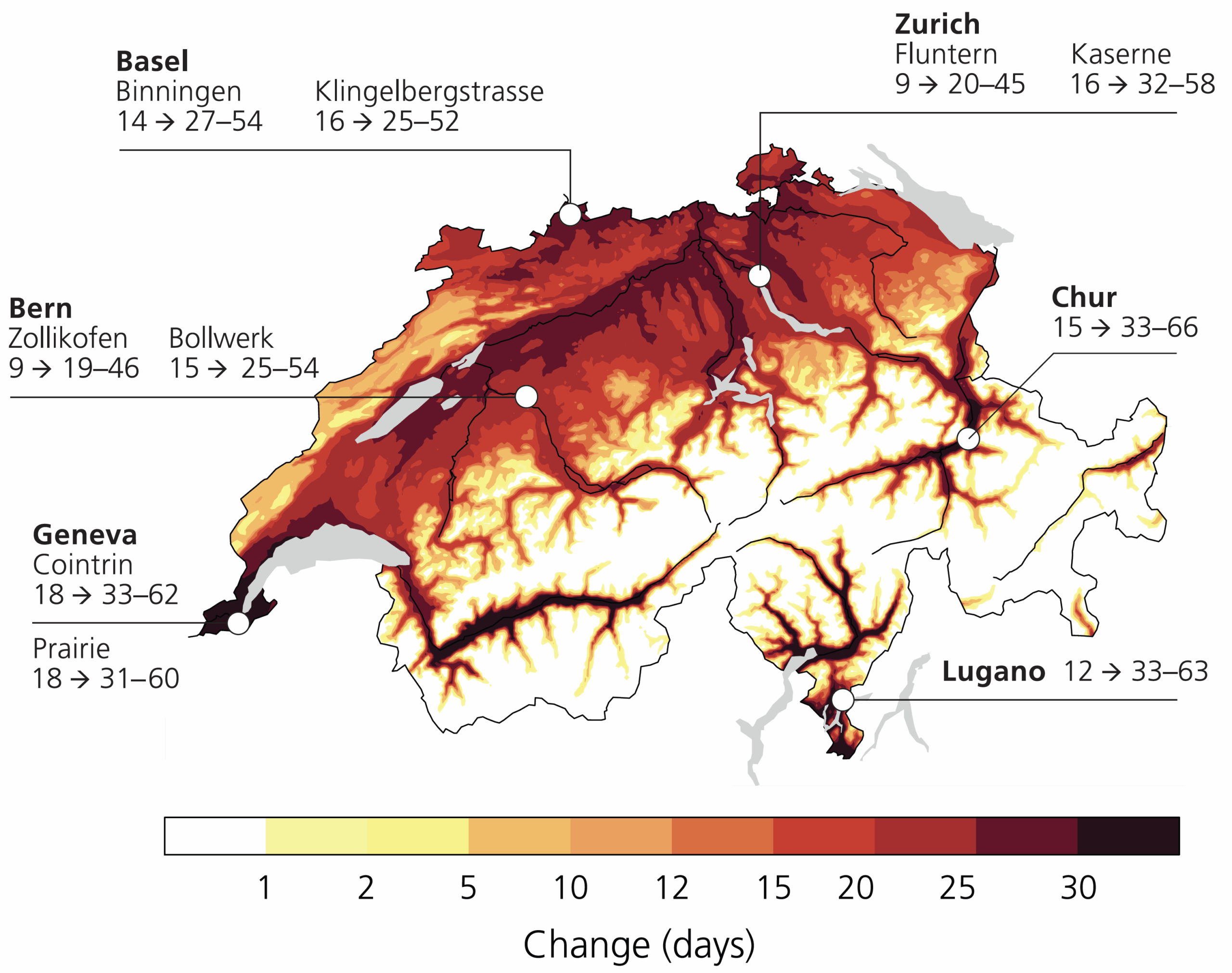 With rising global warming, the number of hot days (>30°C) in Switzerland is expected to roughly triple in a 3-degree world (GWL3.0). The largest impact will be in urban areas, as depicted in the Figure on the right.