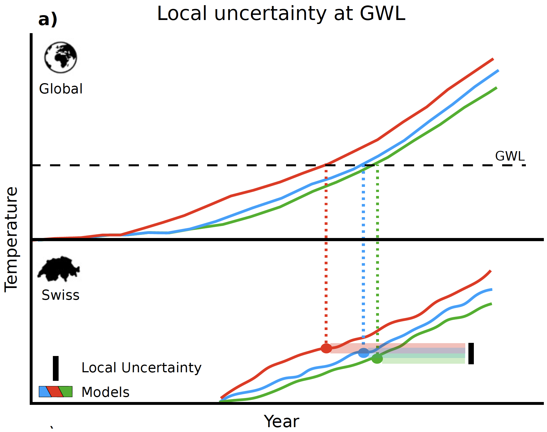 The Figure above depicts the approach taken by MeteoSwiss to assess the consequences for Switzerland at specific GWLs: