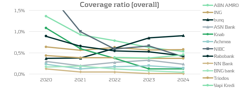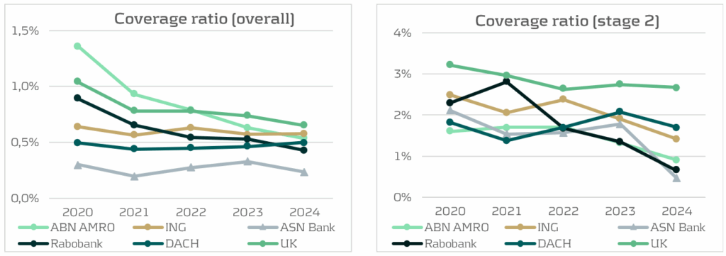 The Dutch banks are expecting lower credit losses compared to previous years, resulting in lower coverage ratios. There are three main drivers for this. Firstly, several banks (e.g. ASN Bank) mention a significantly more positive macroeconomic outlook. The second driver is not forward-looking but is a realization of higher-than-expected increases in house prices in 2024. As mentioned by ABN Amro and Rabobank, the Dutch house price index (HPI) was expected to rise around 2% in 2024, while this turned out to be 9%. Higher house prices improve collateral values and therefore lower the future Loss Given Default (LGD) in case of a mortgage default in the IFRS 9 models. The third driver behind lower ECL is that many banks decreased the management overlays to the model outcomes in 2024 compared to 2023. Combining these three drivers pushes coverage ratios down.