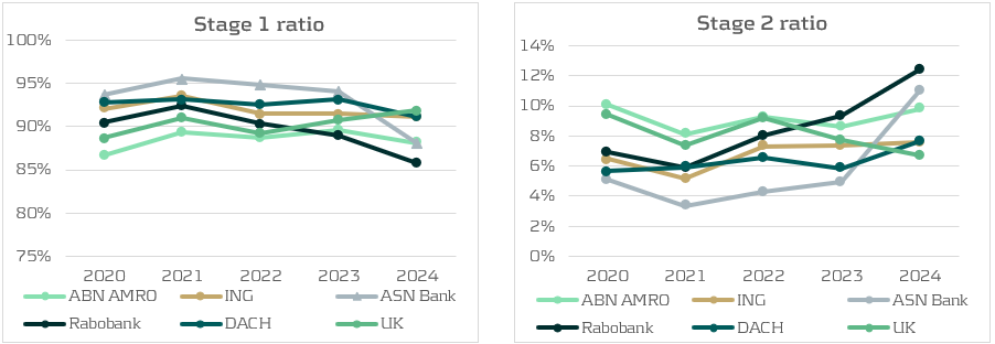 Another development in 2024 is the increase in Stage 2 exposures at Dutch banks. Rabobank, ASN Bank, and ABN Amro all reported more Stage 2 loans, largely the result of framework updates and stricter Significant Increase in Credit Risk (SICR) definitions. At Rabobank, an ECB regulation and Risk Based Strategy approach was implemented in the Stage 2 framework for residential mortgages, raising the allowances for ECL. The increase is predominantly related to mortgage clients who have not voluntarily provided updated financial income information. Hence, the increase in Stage 2 ratio is not caused by an increase in the risk of default but because the framework required a risk-based treatment of missing data. Combined with a decrease in Stage 1 exposures, it is concluded that these loans transferred from Stage 1 to Stage 2. ASN Bank also confirms this trend by a large transfer of interest-only mortgages from Stage 1 to Stage 2.