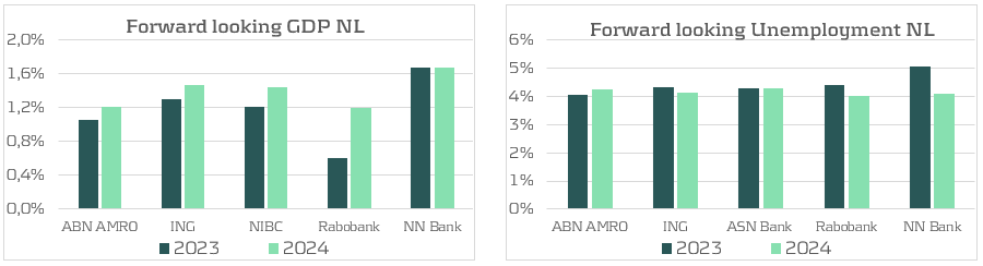 For the analysis of macroeconomic outlooks, the focus is on the Dutch banks as these outlooks are often for the national economy and thus not comparable between countries. In practice, most Dutch banks define three scenarios (base, up, down) and the average allocation is 50% to the base scenario, with the remaining 50% skewed to the downside (32%) rather than the upside (18%). Although the probabilities have not been skewed positively, the outlook of all scenarios has improved compared to 2023. The five Dutch banks reporting their forward looking GDP figures all show improvements, with only NN Bank holding the prediction from last year. At the same time, the predicted unemployment has decreased for most banks reporting this figure. Both of these signal the improved macroeconomic conditions that lead to lower ECL.