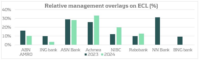 The second driver behind the lower coverage ratios is the decrease in management overlays, which most banks reduced in 2024 compared to 2023. Overlays remain an important tool to capture risks not covered by the models, as also highlighted by the ECB in 2024 (IFRS 9 overlays and model improvements for novel risks). While the ECB welcomes the use of overlays to capture novel risks, it also warns for misuse. Specifically, the ECB would like to see overlays applied at the parameter level, and not at the total ECL level, as most Dutch banks do. According to the report there is still room for a lot of improvements in the use of overlays in IFRS 9 modeling. Amongst the Dutch banks, the average overlay decreased from 11% in 2023 to 8% in 2024. ABN Amro discontinued the overlay for geopolitical risk and decreased the overlay for nitrogen reducing measures on livestock farming business. ING decided to fully abandon the management overlays in place for the Covid-19 support program, which had been in place for several years. Other overlays like those for climate transition risk, mortgage portfolio adjustments and inflation and interest rate increases were reduced but are still in place. Some other banks, like BNG and NN Bank completely discontinued all management overlays. For NN Bank, the previous overlay was in place related to rising interest rates and high inflation. As for BNG, the overlay was meant to account for an increased risk for the healthcare sector. After a thorough evaluation of the sector, BNG has concluded that the models now correctly reflect the risks in the healthcare sector and the overlay is no longer required.